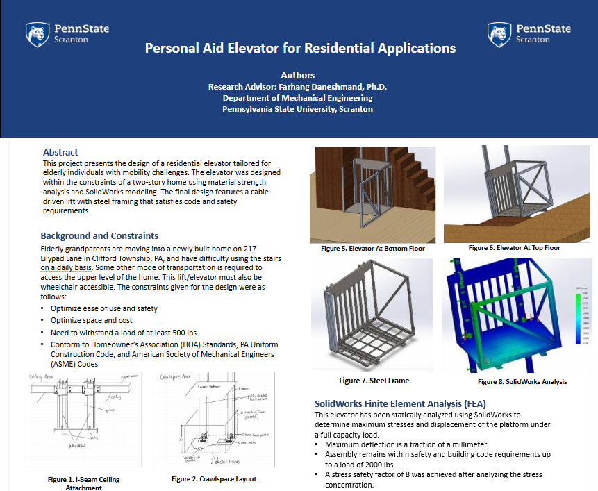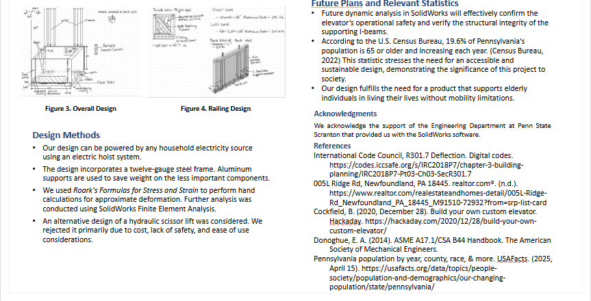 This project involved the mechanical engineering design and analysis of a residential elevator/lift system intended to improve accessibility in a two-story home environment. The primary goal was to create a system that is safe, reliable, space-efficient, and compliant with applicable codes, while meeting defined load and accessibility requirements.