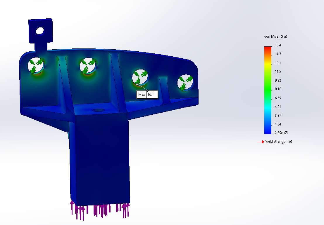 During the Finite Element Analysis, the components were subjected to the worst-case loading to ensure proper operation during extreme use. For the subframe mounting locations, they were subjected to a 1.5G lateral acceleration in both horizontal directions, as well as a 6-inch instantaneous compression of the suspension, resulting in a large upward acceleration under assumed resonance conditions.