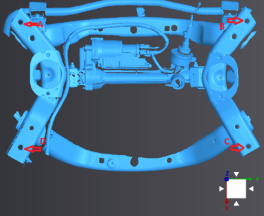 Controlled scanning of major automotive components (front subframe, rear subframe, frame sections, brackets)
