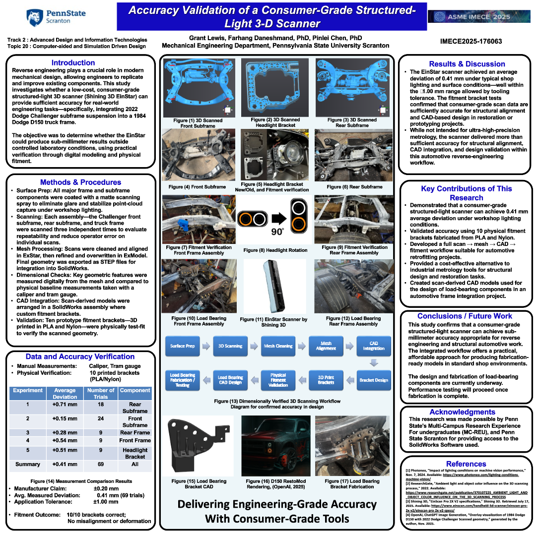 The research project “Accuracy Validation of a Consumer-Grade Structured-Light 3D Scanner” was presented at the American Society of Mechanical Engineers (ASME) International Mechanical Engineering Congress & Exposition, a major international engineering research conference, where it earned Third Place in the undergraduate research poster competition.